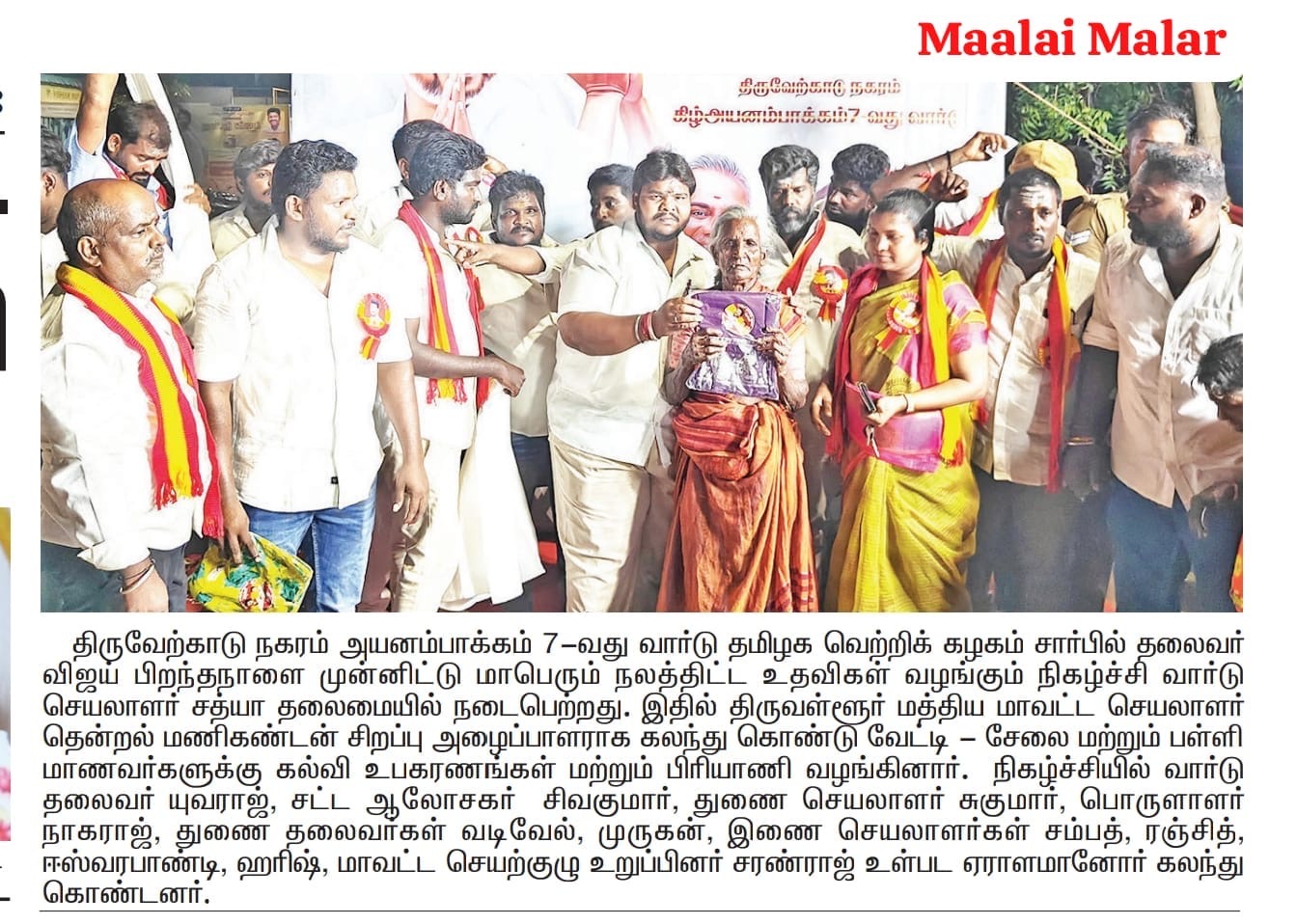 தவெக வில், நாங்கள் சமூக முன்னேற்றம் மற்றும் முழுமையான நலத்திட்டங்களில் ஈடுபட உறுதிபூண்டுள்ளோம். ஆவடி தவெக (TVK) அணியினர், தொகுதியில் மக்களுக்கு உதவ பல்வேறு முயற்சிகளை முன்னெடுத்துள்ளனர். கீழே, எங்கள் முயற்சிகளைப் பிரதிபலிக்கும் புகைப்படங்களை காணலாம்.