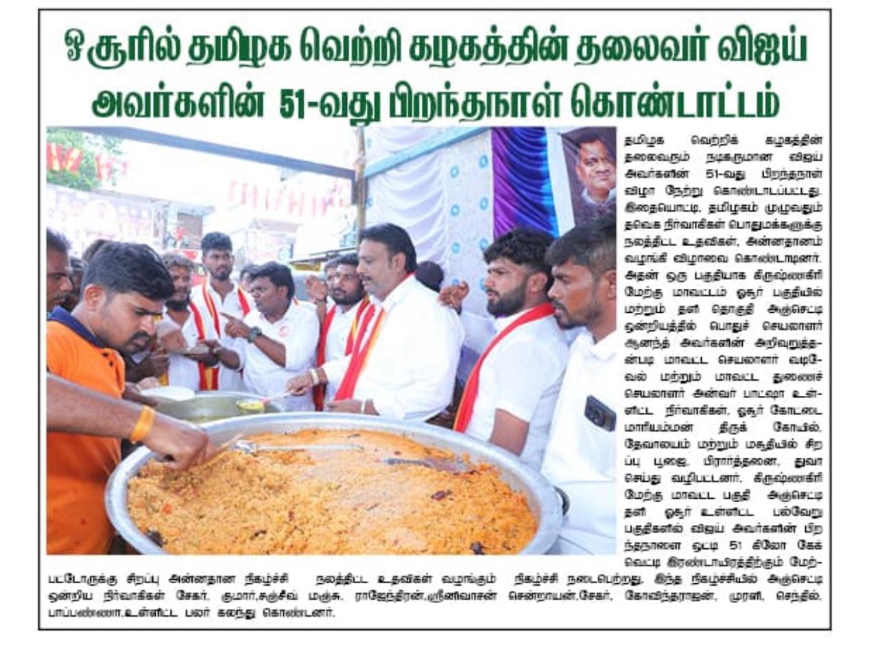 தவெக வில், நாங்கள் சமூக முன்னேற்றம் மற்றும் முழுமையான நலத்திட்டங்களில் ஈடுபட உறுதிபூண்டுள்ளோம். தளி தவெக (TVK) அணியினர், தொகுதியில் மக்களுக்கு உதவ பல்வேறு முயற்சிகளை முன்னெடுத்துள்ளனர். கீழே, எங்கள் முயற்சிகளைப் பிரதிபலிக்கும் புகைப்படங்களை காணலாம்.